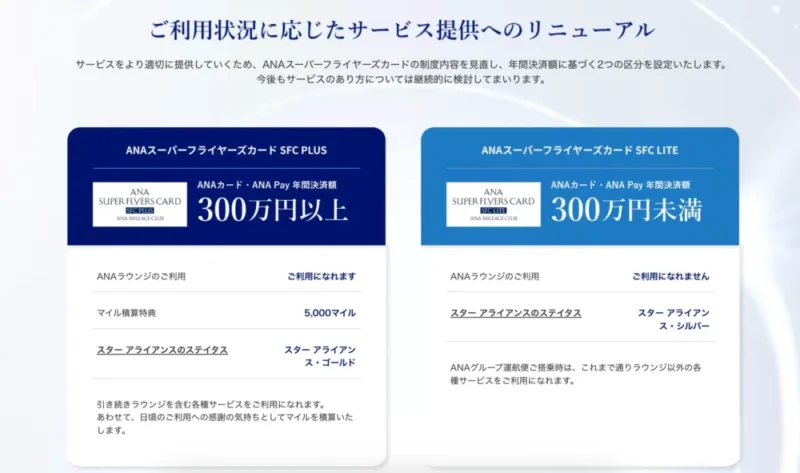 - SFC PLUS: ANAカードやANA Payで年間300万円以上決済する人は、これまで通りANAラウンジが利用可能。